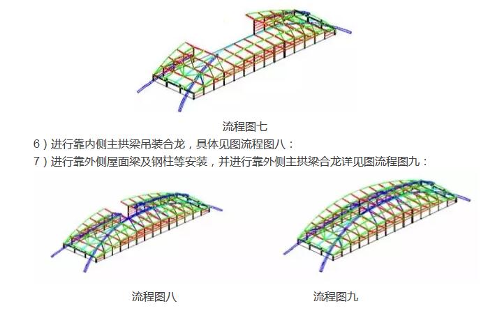 2)為了使屋面結(jié)構(gòu)形成穩(wěn)定的體系,所以對(duì)兩端第二段中間拱進(jìn)行安裝,并進(jìn)行兩端屋面梁和鋼柱的拼裝安裝,同時(shí)對(duì)兩端屋面梁之間的連梁和水平剪刀支撐進(jìn)行安裝,具體如流程圖二: